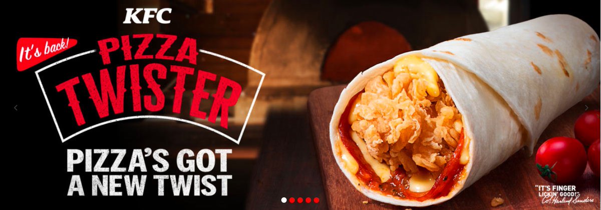 It's a concoction that, as they say themselves, 'can only be classified as a work of art' and it consists of a cheesy bite pizza, popcorn chicken, sweetcorn and KFC gravy. Order the new Super Twister Deal 4 twisters 4 pcs chicken large fries & coleslaw Pepsi for only AED 65!. Bring the KFC Twister back to the USA 596 likes The KFC Twister is available internationally, but it was discontinued in the USA sometime around 12 KFC needs to bring this healthy menu option back!.