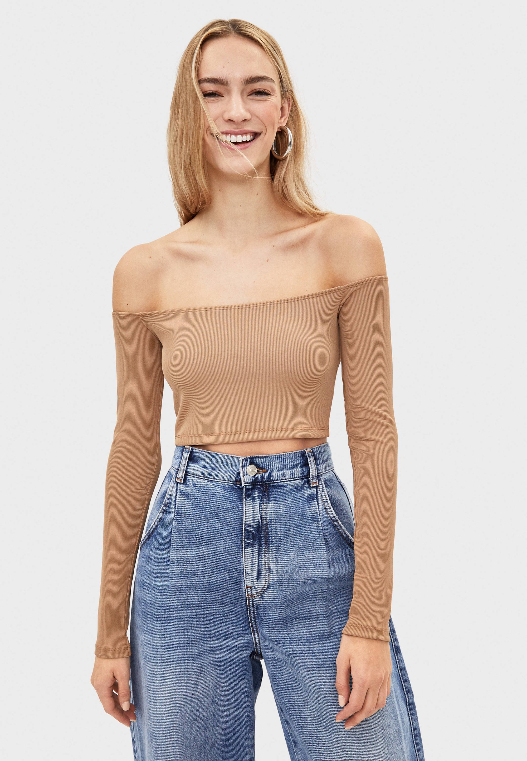 Bershka Geripptes Top Mit Carmen Ausschnitt Langarmshirt Beige Zalando De
