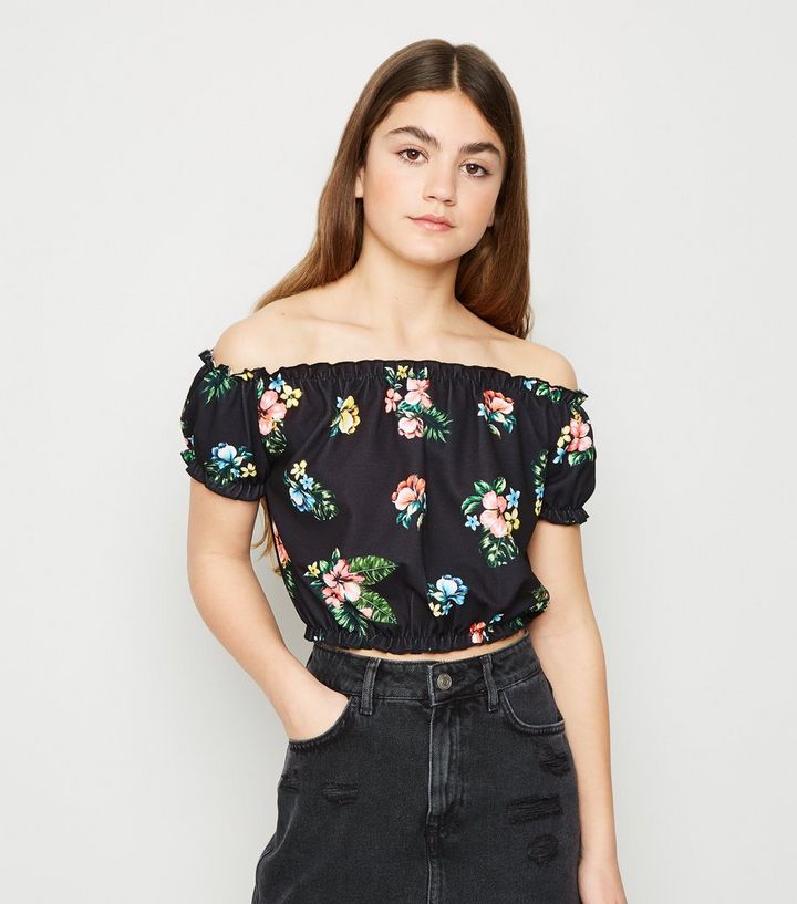 Girls Schwarzes Crop Top Mit Bardot Ausschnitt Und Blumenmuster New Look