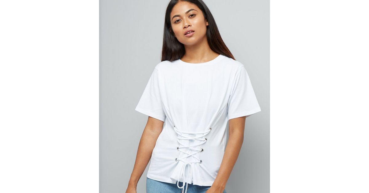 Petite Weisses T Shirt Mit Korsett Schnurung New Look