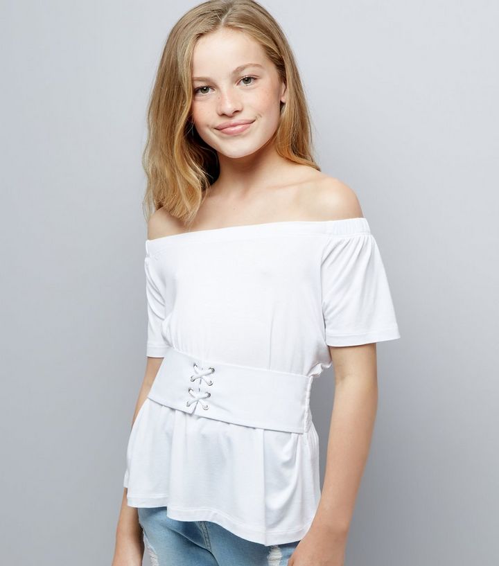 Teenager Weisses Top Mit Bardot Ausschnitt Und Korsett Taille New Look