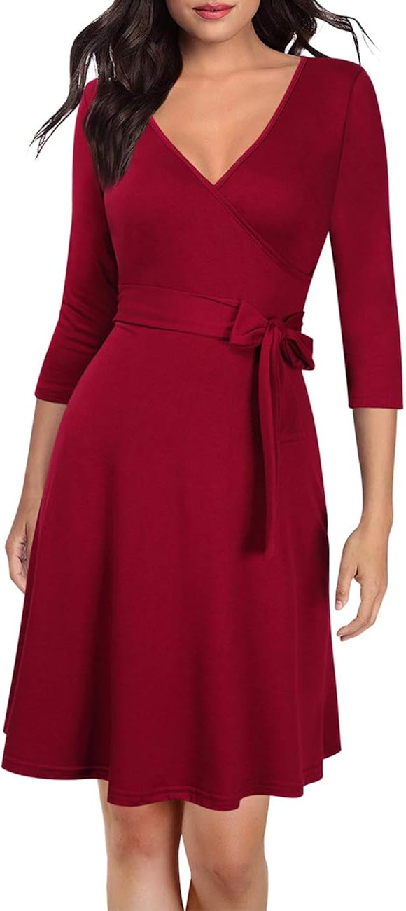 Kojooin Damen Kleid Business Kleid Knielang Wickelkleid 3 4 Arm Mit V Ausschnitt Und Gurtel Bekleidung Business