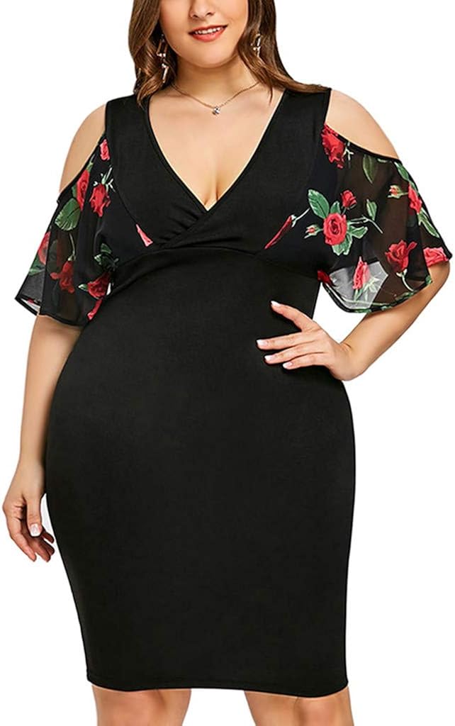 Frauit Damen Plus Size Bleistift Kleid Vintage Rundhalsausschnitt Blumendruck Bodycon Tragerlose Schulter Kleid Business Cocktailkleider Knielang Mit V Ausschnitt