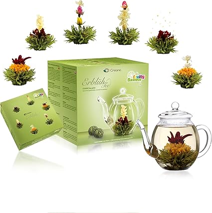 Creano Teeblumen Mix Geschenkset Erbluhtee Mit Glaskanne Gruner Tee Fruchtig Aromatisiert Teerosen In 6 Sorten Blooming Tea Tee Geschenk Weihnachten Amazon De Kuche Haushalt