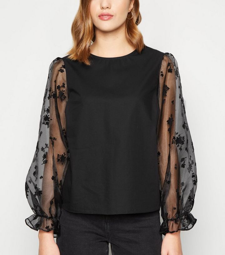 Schwarzes Top Mit Blumenmuster Und Puffarmeln Aus Organza New Look