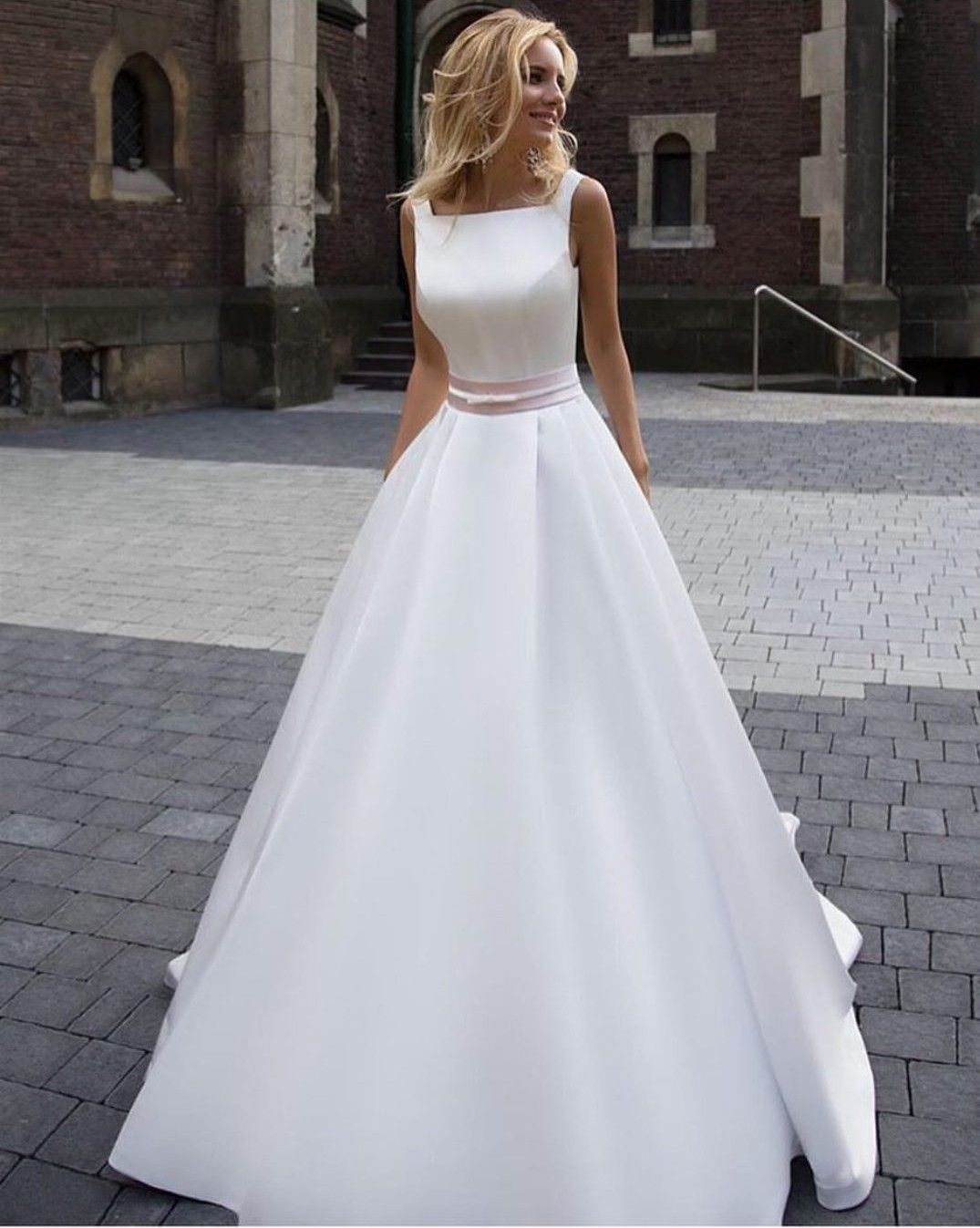 Romantic Bateau A Line White Satin Wedding Dress Backless Sweep Train Vestido De Novia Hochzeitskleid Brautkleider 18 Brautmode
