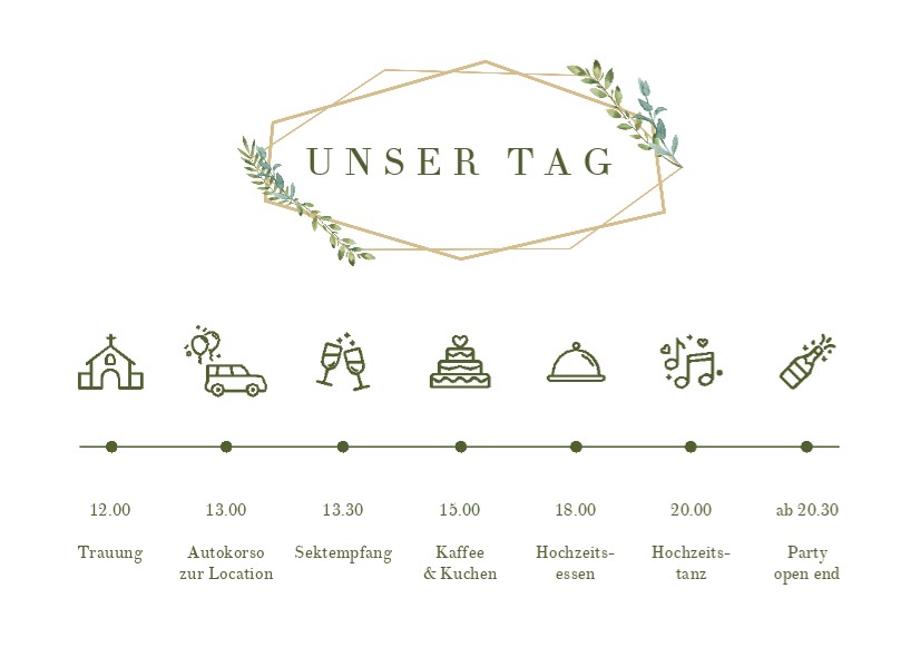 Hier findet ihr eine wunderschöne Timeline Hochzeit Vorlage sowie Icons als kostenfreien Download für eure indiviuelle Timeline. Individueller esablauf für eure Hochzeit Handgemalte Icons und NaturpapierOptik Lasst eure Gäste wissen wie euer großer geplant ist Die Inhalte sind alle personalisierbar, auch die Icons können bei Bedarf angepasst werden Größe Postkartenformat A6 (105x148mm) Papier. Esablauf hochzeit vorlage Kostenloser Versand verfügbar Kauf auf eBay eBayGarantie Originelle Hochzeitsspiele finden für Gäste & Brautpaar ab 29, Hochzeit Vorlage auf eBay Bei uns findest du fast Alle HochzeitsIcons und Vorlagen für euren Ablaufplan / Timeline findet ihr bereits bei uns im Hochzeitblog zum DownloadDabei könnt ihr 19 verschiedene Icons in 32.