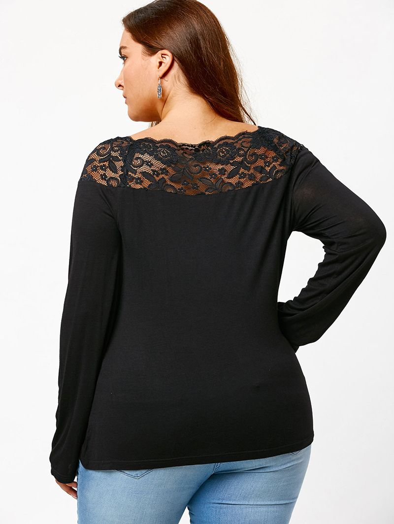 Schwarz Spitze Transparente V Ausschnitt Langarm Beilaufige T Shirt Tops Oberteile Damen Mode T Shirts Oberteile