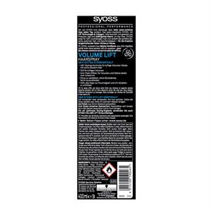 Hairspray Volume Lift Syoss Volume Lift Hairspray provides 48h lightweight stylecontrol with extra strong hold and gives the hair 100% airy volume Its formula is easy to brush out, nonsticky and leaves no residue Syoss Volume Lift Hairspray also helps to protect the hair from humidity and UV radiation. Haarverzorging Volume Lift 48 uur pushup volume effect Nieuw SYOSS met LIFT TECHNOLOGIE & COLLAGEEN, ontwikkeld met en getest door kappers, geeft het haar een pushup effect zonder het te verzwaren 48uur lang Elke dag een luchtig volume in uw haar, alsof u net terugkomt van de kapper. Syoss Volume Lift Volume Hair Spray 400 ml Pack of 3 37 out of 5 stars 12 £1195.