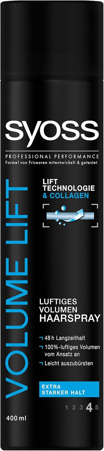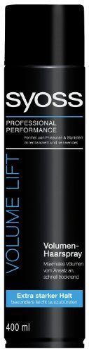 Syoss Volume Lift Haarspray extra starker Halt, 400 ml 400 ml (0,99 € je 100 ml) (45) Hinweise 3,95 € Einkaufswagen. Volume Lift Haarspray mit Lift Technologie & Collagen für 100 %luftiges, langanhaltendes Volumen und extra starkem Halt, ohne das Haar zu beschweren. Ich habe die Volume Produkte von Syoss nun ausgiebig getestet und finde sie super Das Shampoo schäumt gut, wäscht sauber und lässt sich ohne Rückstände auswaschen.