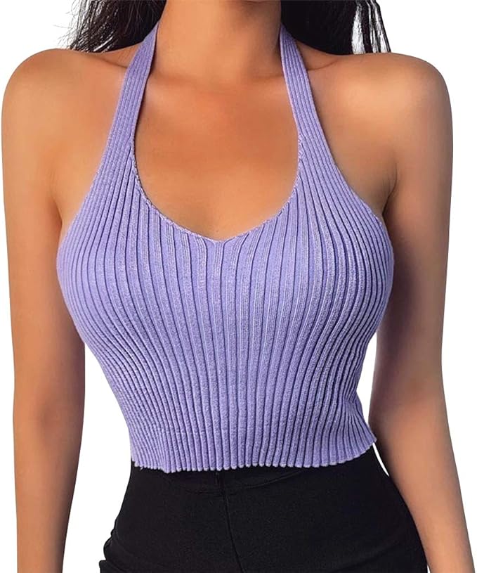 Crop Tops Damen Sommer Teenager Madchen V Ausschnitt Stricken Spagehtti Trager Top Knitting Halter Armelloses Bauchfrei Tank Tops Frauen Neckholder Weste Kurze Oberteil T Shirt Cami Shirt Lila Amazon De Bekleidung