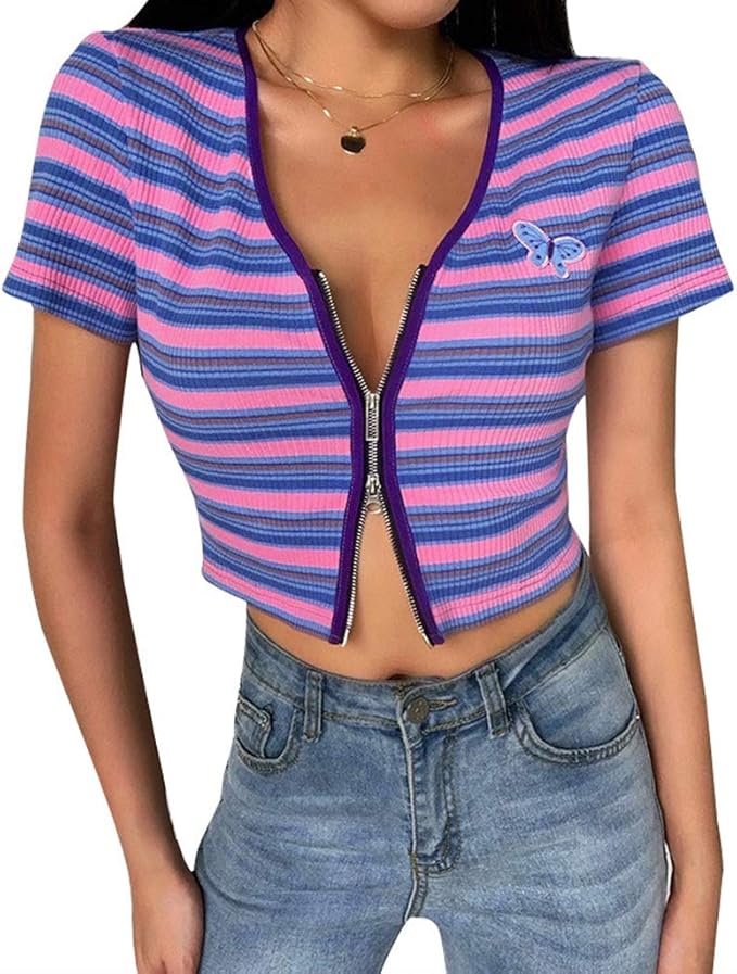 Crop Tops Damen Sommer Teenager Madchen V Ausschnitt Schmetterling Streifen Bauchfrei Oberteile Butterfly Gestreift Blusen Shirt Kurzes Tank Top Frauen Kurzarm T Shirt Mit Reissverschluss Amazon De Bekleidung