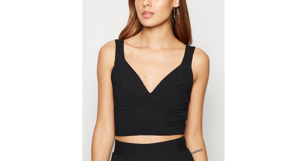 Schwarzes Kurzes Geripptes Top Mit Tiefem Ausschnitt New Look