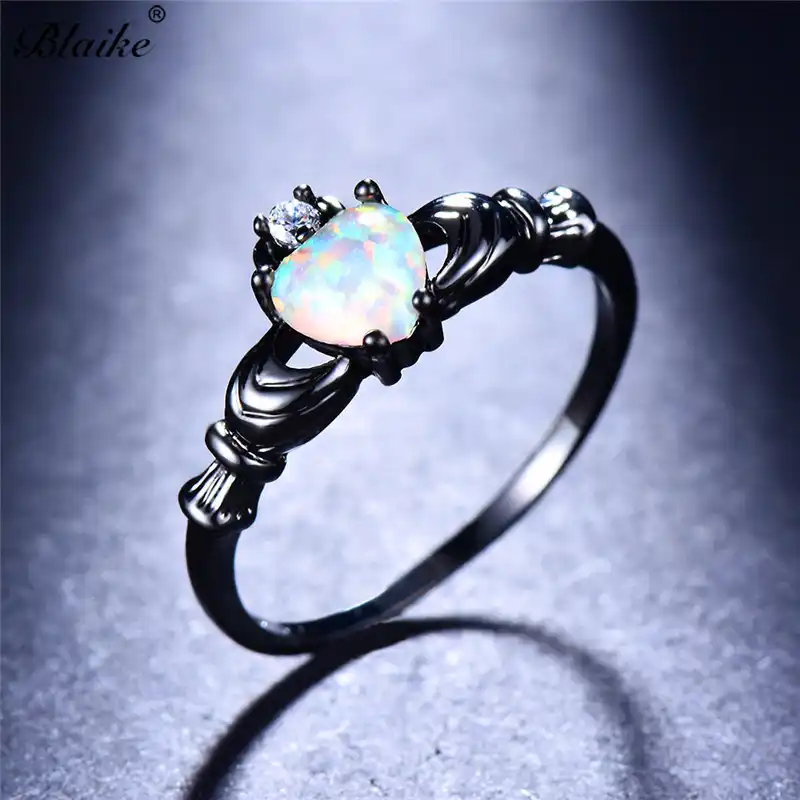Blaike Charming Weiss Herz Feuer Opal Claddagh Ring Fur Frauen Vintage Schwarz Gold Gefullt Finger Schmuck Versprechen Birthstone Ring Verlobungsringe Aliexpress