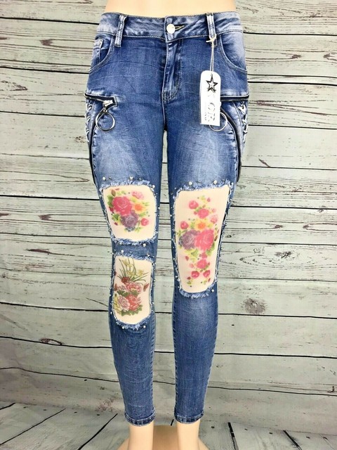 Damen Jeans Original Denim Stickerei Strass Nieten Destroyed 34 42 Blumen Neu Ebay