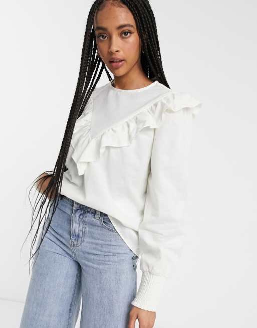 Monki Hoch Geschlossene Weisse Bluse Mit Ruschen Asos