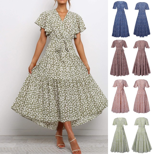 Damenmode Kleider Damen Blumen Abend Kleid V Ausschnitt Kurze Armel Sommerkleid Urlaub Strand Mini Kleidung Accessoires Kleider