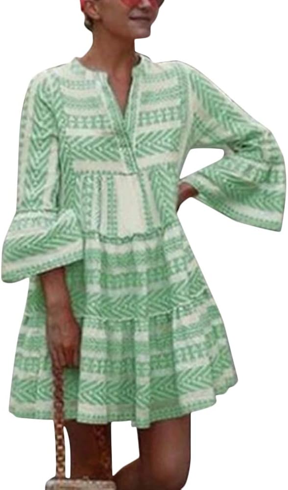 Tomwell Damen Strandkleid Boho Tunika Sommerkleid V Ausschnitt Blumenkleid Loose T Shirt Kleid Floral Minikleid Elegant Casual A Linie Kleid 3 4 Arm Knielang Kleid