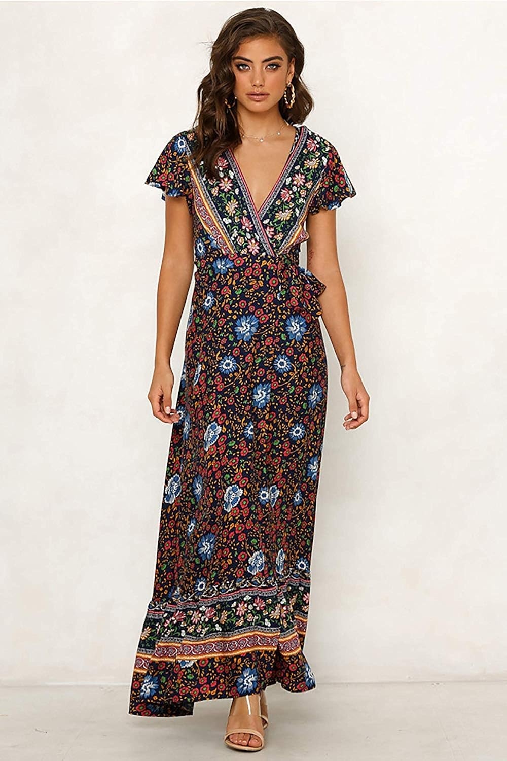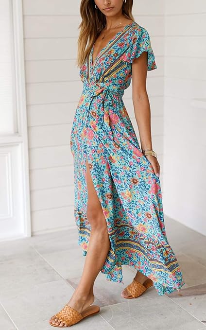 Cindeyar Kleider Boho Sommerkleid V Ausschnitt Damen Vintage Strand Blumen Maxikleid Kurzarm Strandkleid Lang Mit Schlitz Kleider Bekleidung