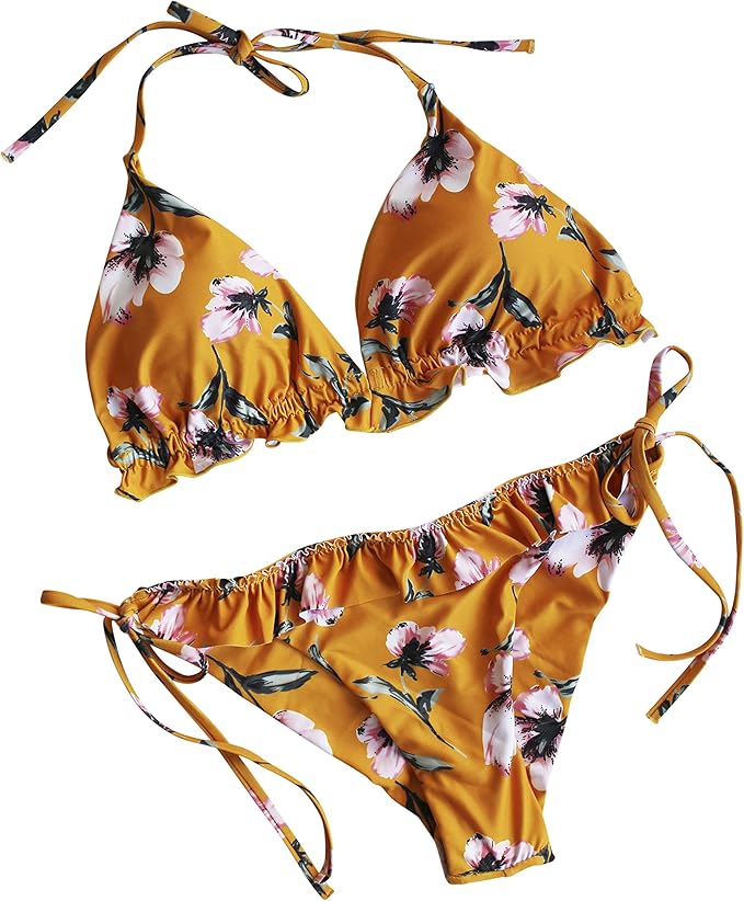 Fereti Damen Bikini Set Gelb Triangel Blumen Motiv Blumenmuster Geposterte Badeanzug Bademode Schalen Ockergelb Blumenprint Amazon De Bekleidung