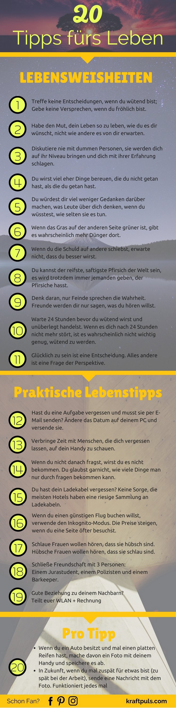 Nr1 mit Dr Heinrich Derksen https//msoundcloudcom/bibelseminarbonn/tipp1furslebenandachtenausdenspruchen. 5 essentielle Tipps fürs Leben, die du in der Schule nicht lernst 5 essentielle tips fuers Leben Mit dem letzten Schultag beginnt der sprichwörtliche Ernst des Lebens und die ehemaligen Schüler stehen plötzlich vor der Herausforderung, das eigene Leben alleine zu meistern. 5 Tipps fürs Leben Sage was wahr ist Trinke was klar ist Esse was gar ist Sammle was rar ist Und bumse was da ist Siehe dir jetzt weitere lustige Sprüche mit Bildern an.