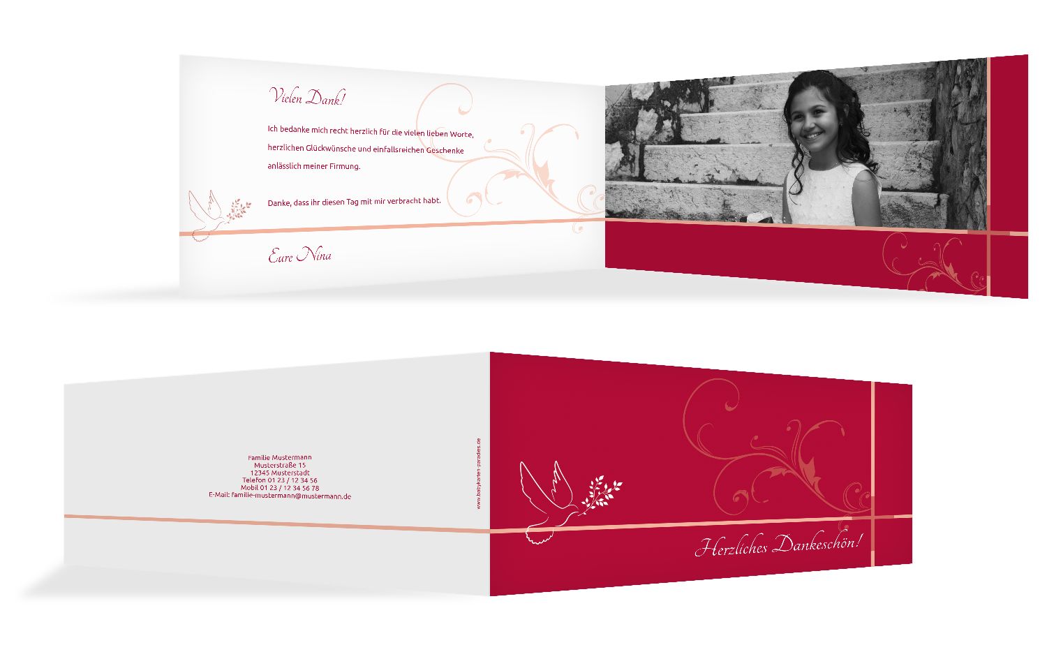 Dankeskarten Firmung drucken lassen Sobald Sie entspannt und mit wenigen Klicks die individuellen Dankeskarten Firmung online gestaltet haben, können Sie den Druck in Auftrag geben Das macht unsere Druckqualität einzigartig Stabiles Qualitätspapier mit einer Stärke von mindestens 300 g/m 2 , das dafür sorgt, dass die Karten zu einem. Schöne Danksagungskarten & Dankeskarten günstig selbst online gestalten mit oder ohne Fotos 2 Werktagen Lieferung!. Dankeskarten Firmung Wählen Sie dem Favoriten Wir wünschen Ihnen als Kunde nun eine Menge Erfolg mit Ihrem Dankeskarten Firmung!.