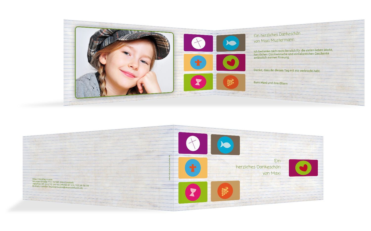 Dankeskarten zur Kommunion selbst gestalten Versandkostenfrei • NullFehlerGarantie • Gratis Umschläge • Kostenloser Kundenservice Danksagungskarten zur Kommunion jetzt online bestellen. Dankeskarten zur Kommunion selbst gestalten Versandkostenfrei • NullFehlerGarantie • Gratis Umschläge • Kostenloser Kundenservice Danksagungskarten zur Kommunion jetzt online bestellen. Dankeskarten zur Firmung selbst gestalten Mit uns haben Sie die Möglichkeit, Ihre Dankeskarten zur Firmung passend zu den von Ihnen verschickten Einladungen zu gestalten Wählen Sie dazu einfach Ihren Kartenfavoriten und fügen Sie diesem in einem nächsten Schritt Ihre ganz eigenen Schliffe hinzu Hier haben Sie einen endlosen Raum an Optionen.