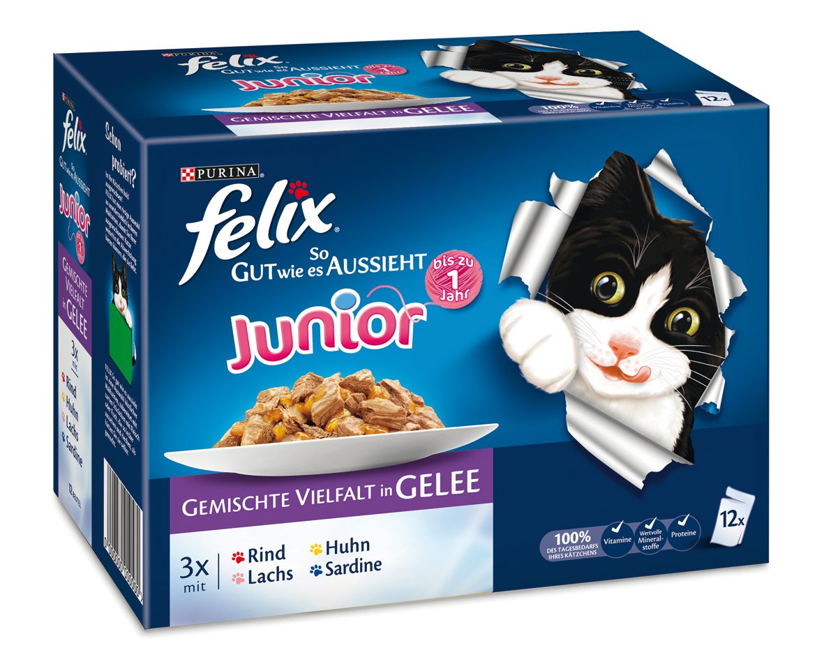 Felix "So gut wie es aussieht" Junior 12 x 100 g Ausgewogenes Nassfutter in leckerem Gelee für Kätzchen in den ersten 12 Monaten , reich an Proteinen, Vitaminen und Mineralstoffen, Mix aus vier tollen Sorten!. Felix Snackart Keine Treffer Schließen Lebensphasen Keine Treffer Schließen So gut wie es aussieht Junior 12x85g Gemischte Vielfalt 47 (15) 3,99 € (3,91 €/kg) 1 Geschmack Felix. WET / Feuchtnahrung ;.