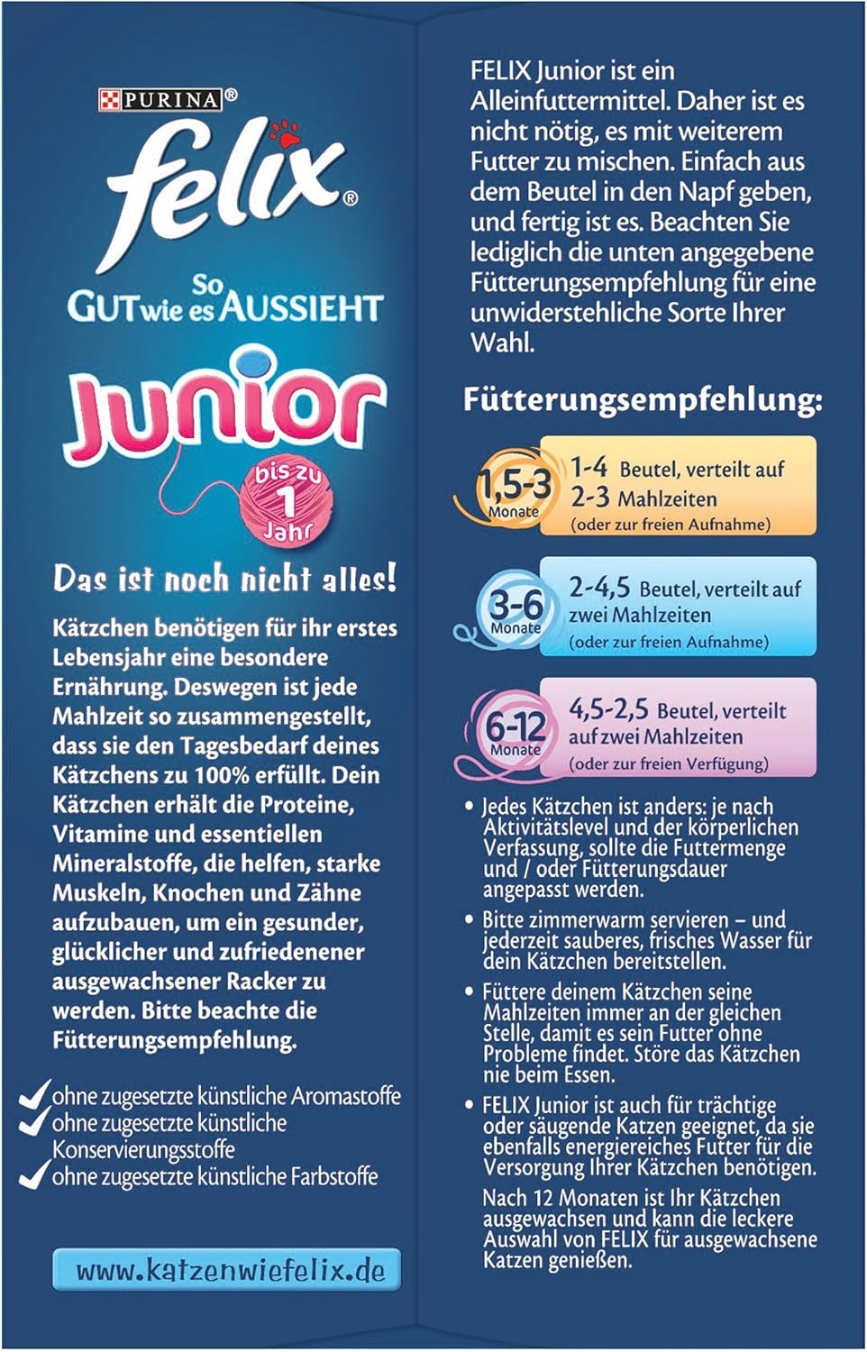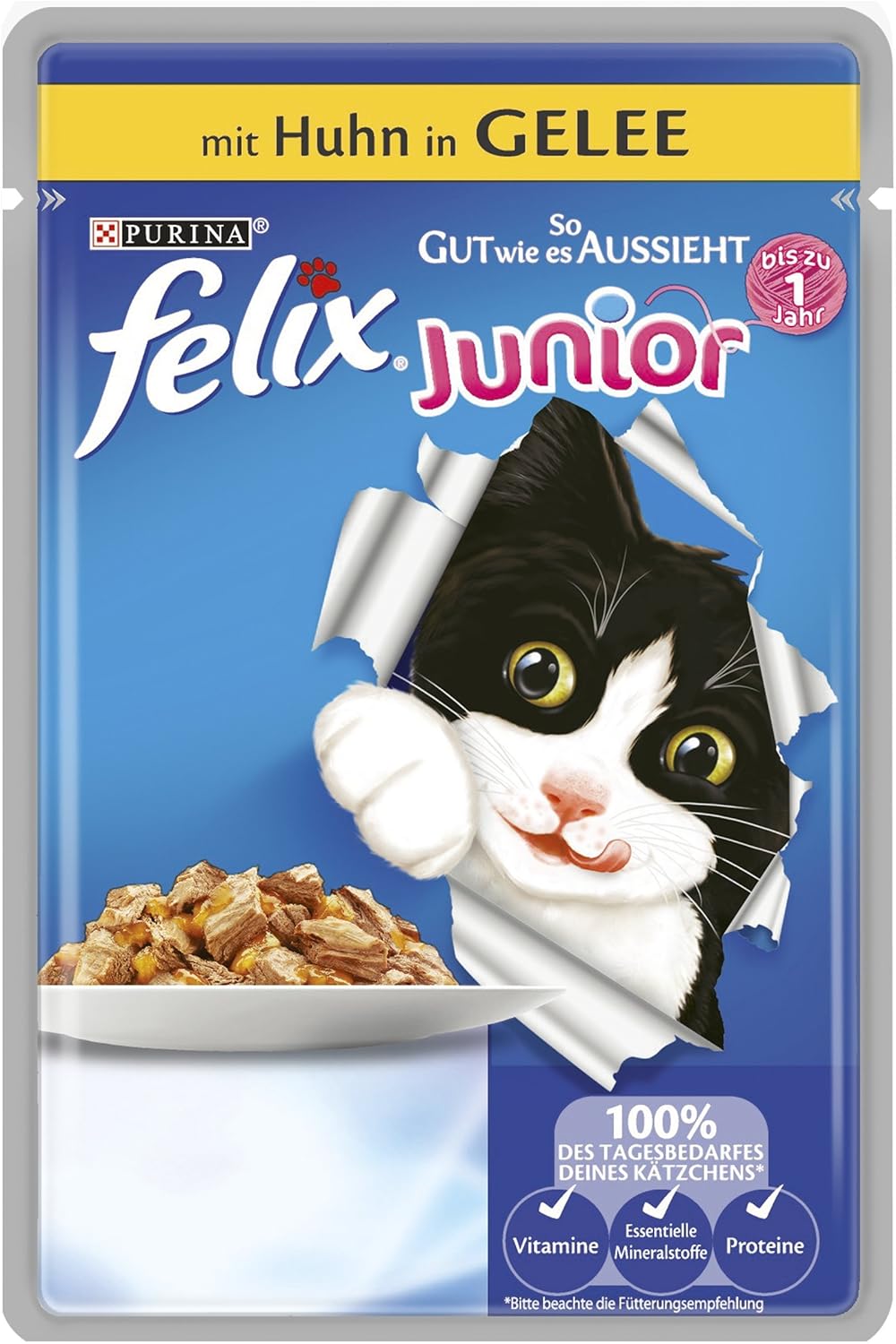 Felix "So gut wie es aussieht" Junior Pouches 212 Monate 48 x 85 g 2 Bewertungen ( 2 ) Ganzheitliches Nassfutter für junge Katzen (2 12 Monate), zarte Häppchen in Gelee, ausgewählte Zutaten, ohne künstliche Farb und Konservierungsstoffe, praktische Portionsbeutel für längere Frische. FELIX So gut wie es aussieht in Gelee mit Huhn und Tomate 26x85g KatzenNassfutter in Gelee von Felix Mit köstlichem Huhn und Tomate für den feinen Gaumen Das Futter ist speziell auf die Bedürfnisse von ausgewachsenen Katzen angepasst. X Kabeljau in Gelee;.