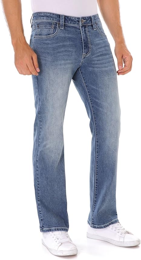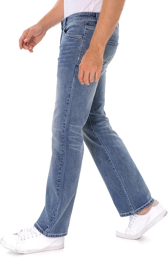 Indigo Alpha Men S Stretch Extensible Boot Cut Fit Distressed Faded Denim Jeans At Amazon Men S Clothing Store