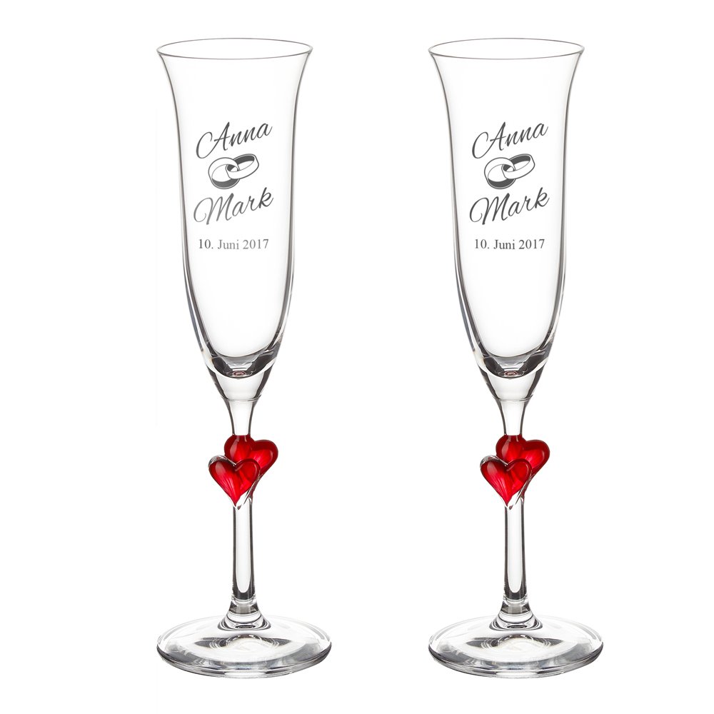 Leonardo Sektgläser mit Gravur von Namen & Datum im Wedding Design als Geschenk zur Hochzeit, Verlobung oder zum Jahrestag inkl gravierter VintageHolzkiste das perfekte Hochzeitsgeschenk ️ 100% LEONARDO Qualitätsglas trifft hochwertige Lasergravur. Das Sektglas Hochzeit mit Gravur ist ein besonders praktisches Geschenk, mit dem das Brautpaar auf den freudigen Anlass der Hochzeit anstoßen kann Es eignet sich auch als Geschenk zu einem Hochzeitstag und kann auch in höherer Stückzahl bestellt werden In der Variante lassen sich die Sektgläser gleichzeitig als GiveAway für die. Sektgläser mit Gravur als Geschenkset zur Hochzeit Diese edlen Sektgläser mit roten Herzen im Stiel, verpackt in einer edlen Holzkiste sind ein wunderbares Geschenk zur Hochzeit "Die Gläser werden mit 2 Namen, einer wählbaren Ring Grafik und dem Wunschdatum graviert".