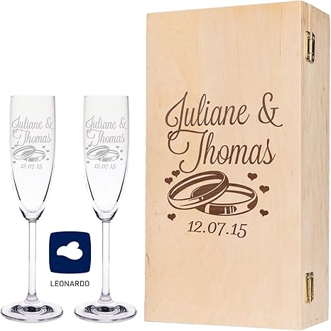 Amazon De Leonardo Sektglaser Mit Gravur Von Namen Datum Im Wedding Design Als Geschenk Zur Hochzeit Verlobung Oder Zum Jahrestag Inkl Gravierter Vintage Holzkiste Das Perfekte Hochzeitsgeschenk