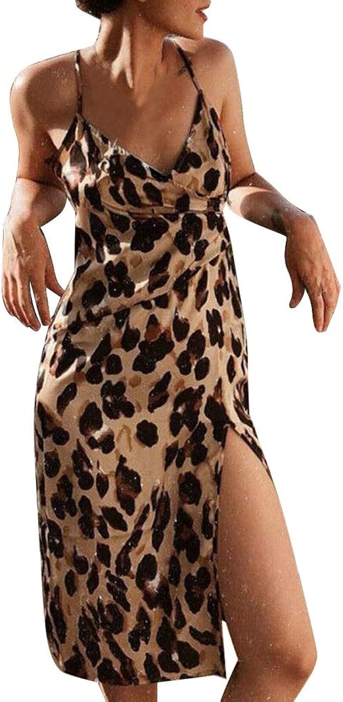 Jiajijiajngy Damen Leopardenmuster Kleid V Ausschnitt Spaghetti Sommerkleider Armellos Strandkleid Freizeit Kleider Mit Schlitz Amazon De Bekleidung