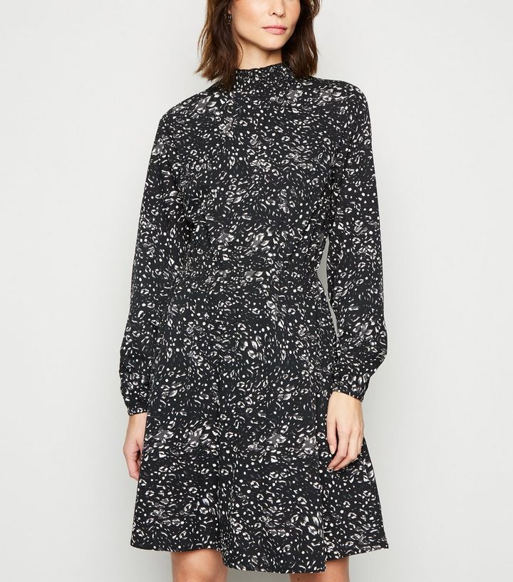 Tall Schwarzes Kleid Mit Gesmoktem Ausschnitt Und Leopardenmuster New Look