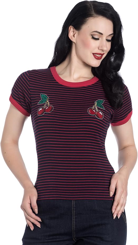 Hell Bunny Ellie 50s Stil Kirsche Rockabilly Gestreiftes Top T Shirt Amazon De Bekleidung