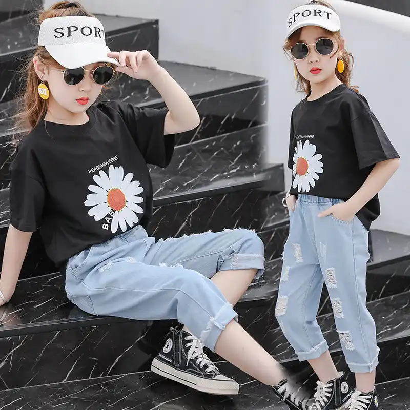 Teenage Girls Clothing Set Summer Kids Tracksuit Daisy Print T Shirt Ripped Jeans Sets Girls Clothes Child Costume 10 12 13 Year Clothing Sets Aliexpress