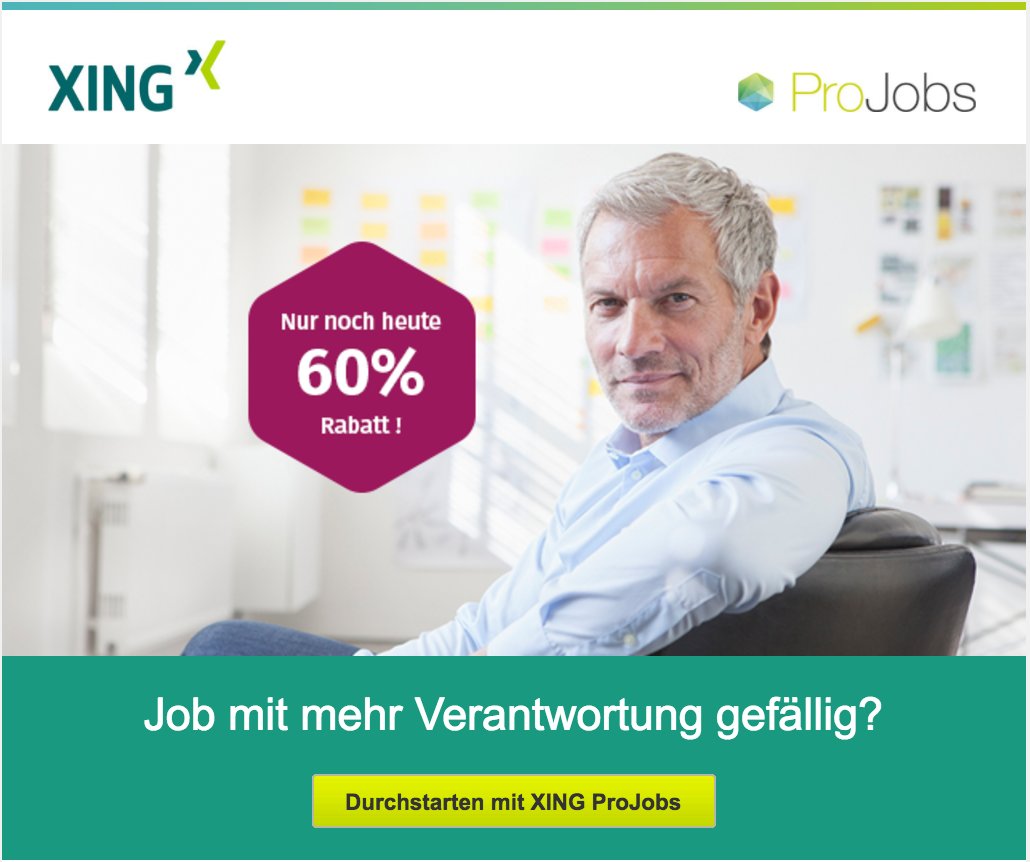 Nachdem XING bereits im September sein Produkt „Der neue XING Stellenmarkt“ gelauncht hat, legt die Plattform heute noch einmal mit XING ProJobs nach Der Titel soll sicherlich bereits die Absichten von XING CEO Thomas Vollmoeller suggerieren, dass XING sich für die Jobsuche der Mitglieder einsetzt (XING pro Jobs). XINGMitglieder, die das ProJobsZusatzpaket gebucht haben, bekommen ab sofort Rabatt bei XING Coaches*Holen Sie sich professionelle Unterstützung für Ihre berufliche Veränderung und sparen Sie bares Geld. Was Xing da macht ist zwar rechtlich o k, trotzdem geht man nicht auf diese Art und Weise mit seinen Kunden um Es ist kein gutes Zeichen, dass Xing seine Kunden durch AGB – Fallen an sich binden muss Ich bin auch Xing Premium Kunde und kündige immer sofort nachdem ich die Anmeldebestätigung erhalten habe.
