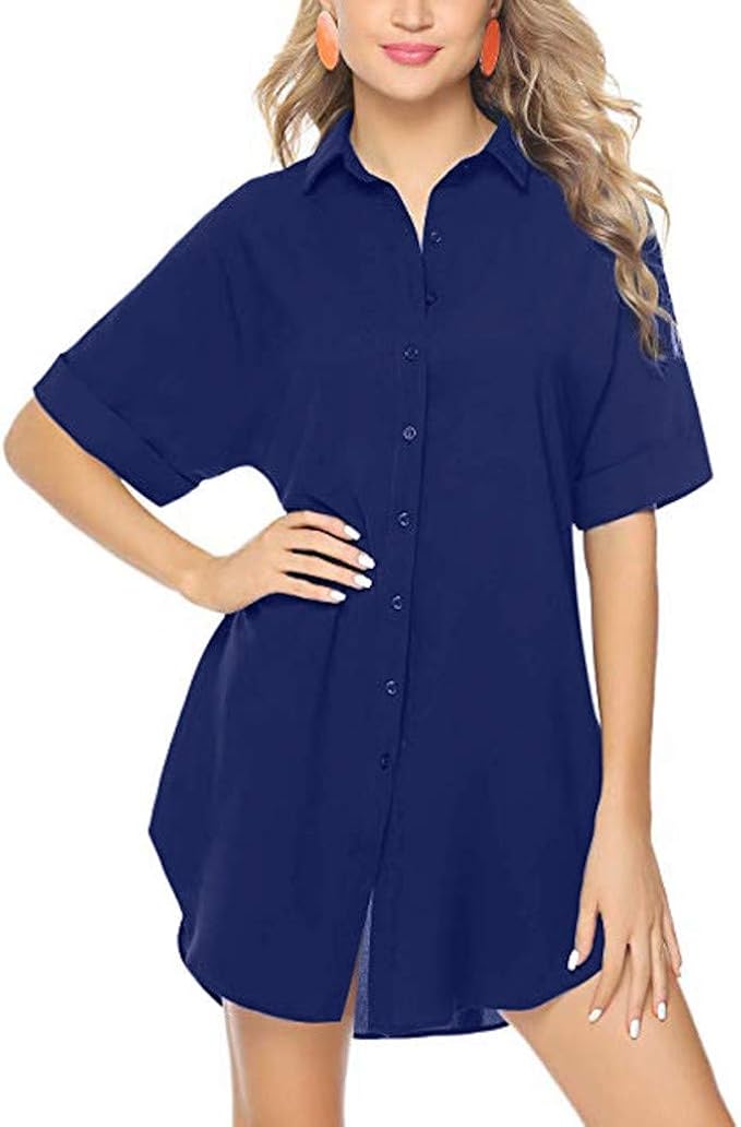 Frauit Damen Kurzarm Midikleid V Ausschnitt Knopf Hemdkleid Lassige Retro Lange Tops Bluse Lose Lange Armel Mini Hemd Kleid Amazon De Bekleidung