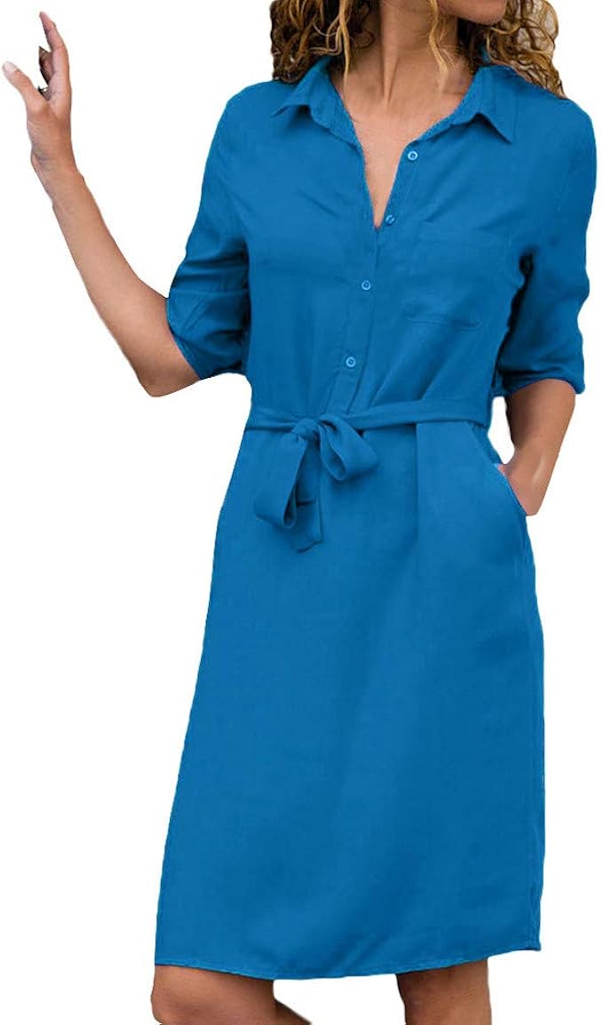Luotuo Damen Casuel Hemdkleid Shirt Kleid Knielang Button Down V Ausschnitt Blusenkleid Mit Gurtel Lange Armel Amazon De Bekleidung