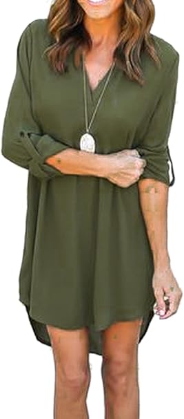 Oksea Damen V Ausschnitt Hemd Kleid Damen 3 4 Arm V Ausschnitt Elegant Lang Blusenkleid Hemdkleid Shirt Kleid Oberteil Kleid Glattes Tuch Maxikleid Mit Amazon De Bekleidung
