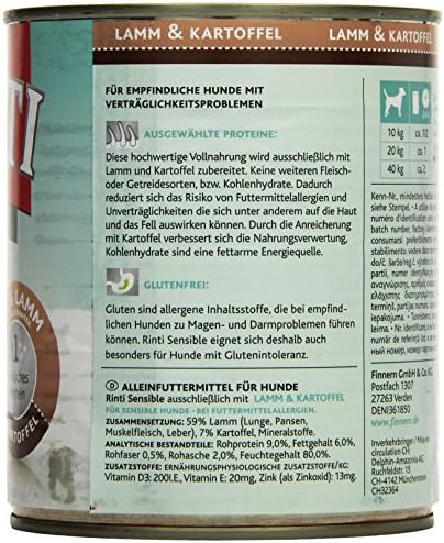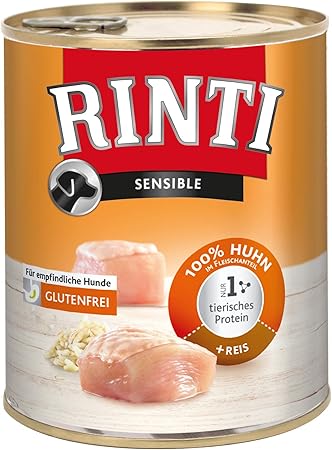 Rinti Sensible HundeNassfutter Rinti Sensible wendet sich speziell an Hunde mit Futtermittelallergien und Futterunverträglichkeiten, denn es enthält nur jeweils eine Proteinquelle Ausgewählte Fleischsorten sind mit Ballaststoffen angereichert und nur die jeweils genannten Getreide oder Gemüsesorten sind im Futter enthalten. Mein Dackel (1 Jahr) bekam bisher Trockenfutter, er hatte ständig Magenprobleme Ich habe alle möglichen Sorten ausprobiert es wurde nicht besser Dann bin ich auf rinti aufmerksam geworden Füttere jetzt rinti sensible HuhnReis und HuhnKartoffel der Kleine frisst es super gerne und hat keine Probleme mehr. Rinti Hundefutter Sensible Lamm & Reis 185 g, 12er Pack (12 x 185 Finden Sie alles rund um ihr Tier bei Amazon Gratis Versand durch Amazon schon ab 29€.