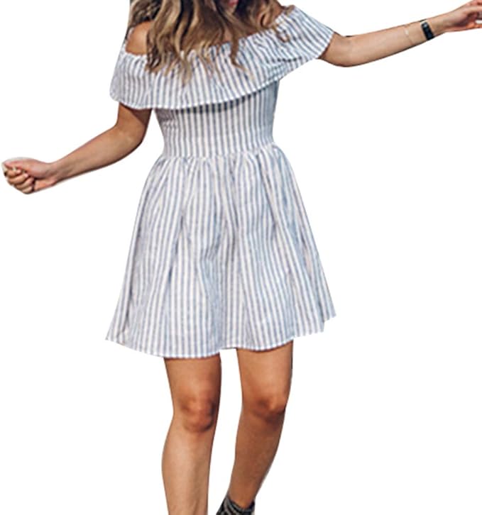 Junkai Damen Sommer Kleid Sexy Aushohlen Aus Der Schulter Kleider Mode Gestreiftes Mini Dress Casual Strand Verein Party Plissiertes Kleid Clubkleidung Amazon De Bekleidung