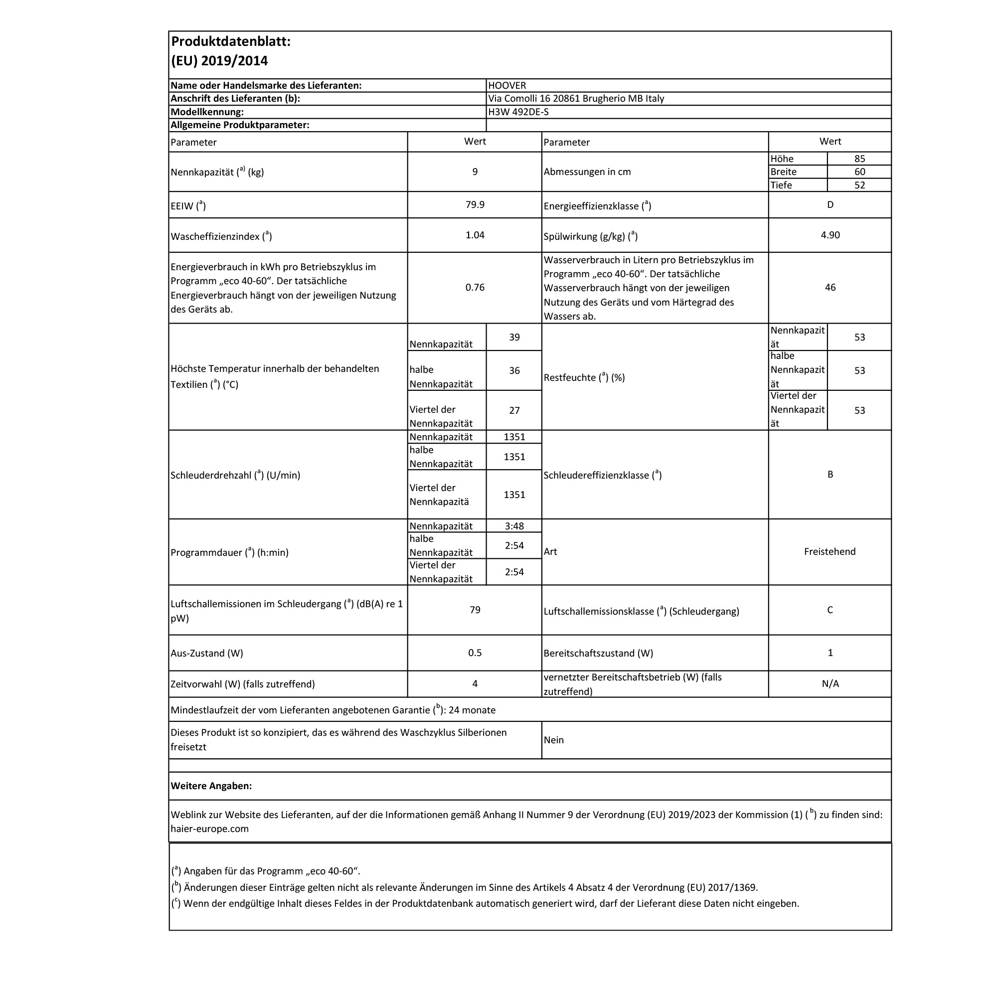Waschmaschine Frontlader A 9kg 1400 U Min Hoover H3w 492de S Ebay