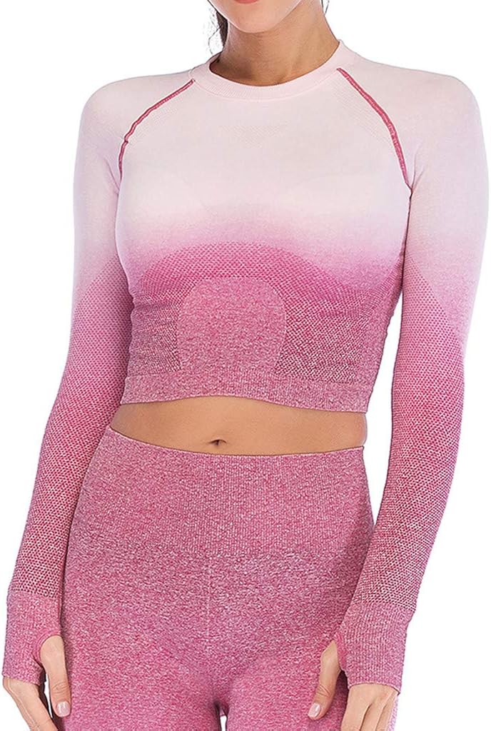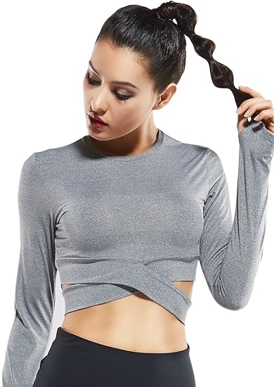 Cross1946 Damen Sport T Shirt Bauchfrei Oberteile Crop Top Fitness Funktionsshirt Sportbekleidung Langarm Laufshirt