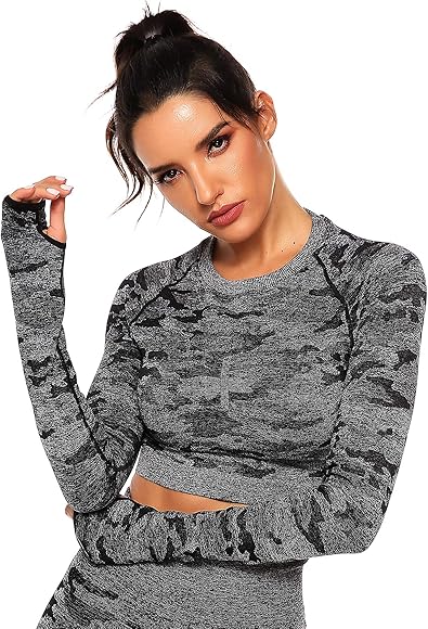 Damen Langarm Workout Shirts Nahtlose Athletic Crop Tops Yoga Sport Activewear Mit Daumenloch Amazon De Bekleidung