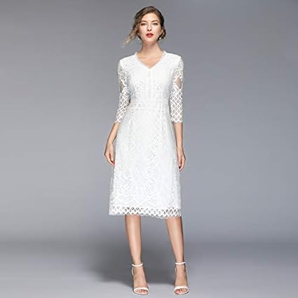 Qunlianyi Bendkleid Tull Lang Weisse Spitze Kleid Haken Blume Aushohlen O Ausschnitt Schlanke Elegante Arbeit Casual Slim Vintage Party Midi Kleider L Amazon De Sport Freizeit