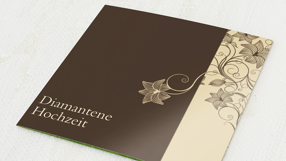 Diamantene Hochzeit – Rückblick auf 60 Jahre Eheleben Nicht vielen Paaren ist es vergönnt, gemeinsam die diamantene Hochzeit zu begehen Wer einen 60 Hochzeitstag erleben kann, möchte diesen natürlich auch im Rahmen von Familie und Freunden gebührend feiern. Vorlage als Einladung Goldhochzeit in Braun mit Goldmuster Diese Vorlage für Einladungen zur Goldenen Hochzeit, die im Format DIN A6 erhältlich ist, zeigt in der Mitte der Karte ein Foto, das zur goldenen Hochzeit einlädt Dieses Foto können Sie hier in die Einladung einfügen. Dazu sollte es in jedem Fall eine Einladung zur Diamantenen Hochzeit sein, die einmalig und genau auf das Hochzeitspaar abgestimmt ist Warum die Diamanthochzeit heute so eine große Bedeutung hat Zu schnell wird heute bei einer Krise das Eheglück leichtfertig weggeworfen.