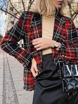 Roter Karierter Revers Quastenbesatz Langarm Damen Blazer Choies