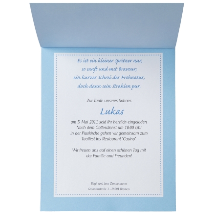 Text fur taufkarte. Lassen Sie sich von uns gerne helfen und finden Sie besondere Wünsche zur Taufe für Paten, Eltern und Verwandte, mit denen jede Glückwunschkarte zur Heiligen Taufe zu etwas wirklich Wundervollem gemacht werden kann Bedenken Sie bitte, dass unsere Wünsche und Glückwünsche zur Taufe allgemeinen Text beinhalten. Taufsprüche über Engel werden daher sehr gerne in eine Taufkarte integriert oder im Rahmen von Taufeinladungen als einleitendes Element verwendet Symbol Wasser;. Spruch für Taufkarte Übersetzung ins Italienische;.