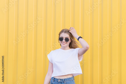 Stylish Cute Girl In Summer Clothes A Happy Girl Poses On The Camera Against The Backdrop Of A Bright Yellow Wall And Smiles Buy This Stock Photo And Explore Similar Images